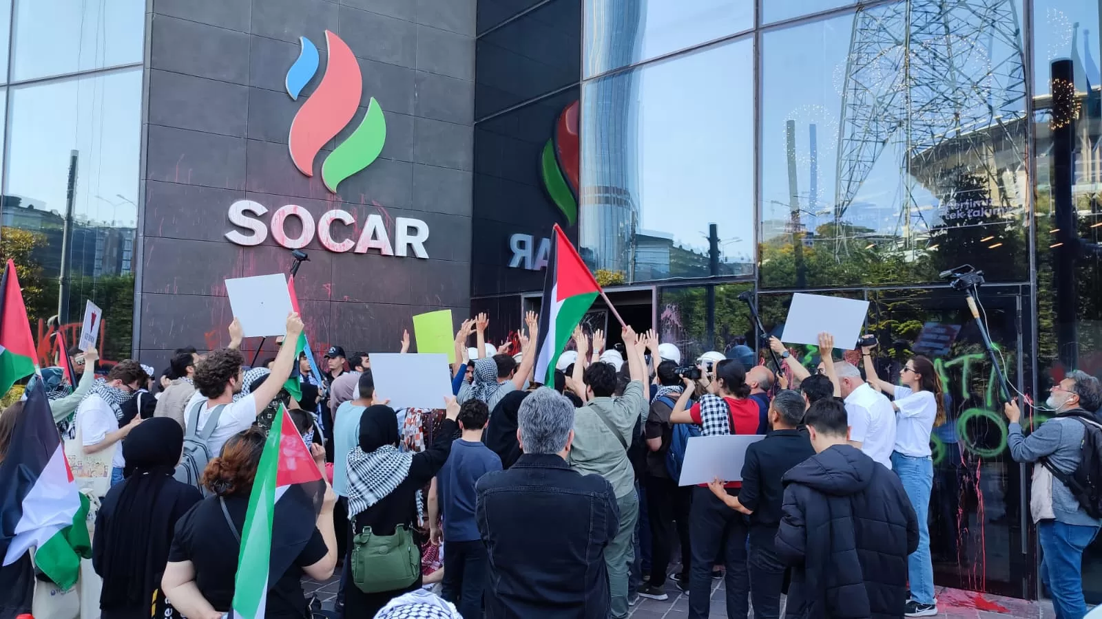 2024 Mayıs ayında Yıldırım, SOCAR’ın İstanbul ofisi önünde düzenlenen “Filistin İçin 1000 Genç” protestosuna katıldı. (Çevirenin notu: Söz konusu protesto, Direniş Çadırı ile FİBG ortak eylemidir.)